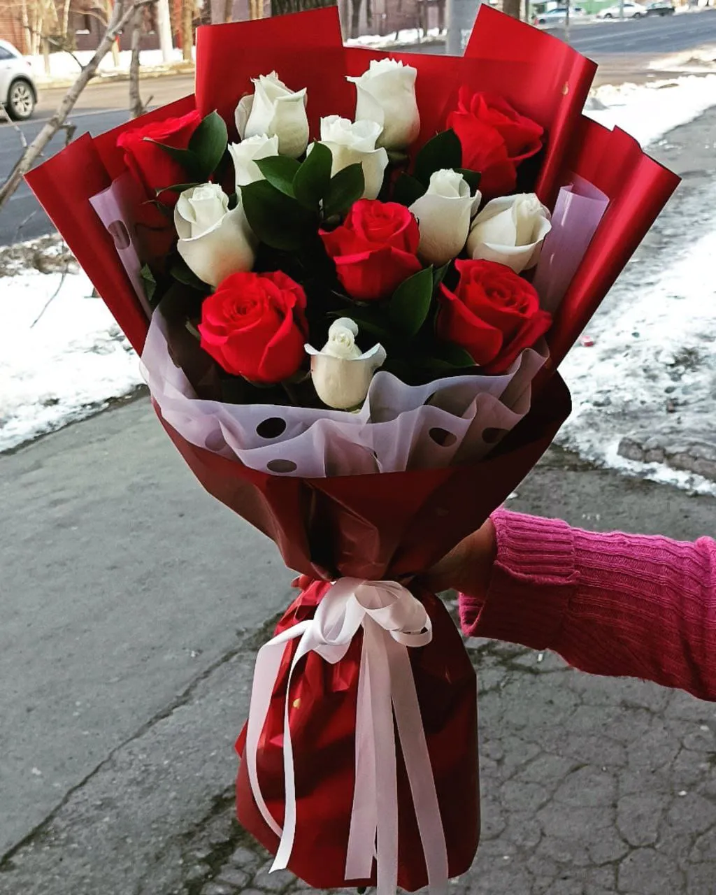 Этот великолепный букет из красных и белых роз, гармонично оформленный в элегантной красной упаковке, словно символизирует единство страсти и чистоты. Каждая роза в этом букете — это не просто цветок, а целая история, наполненная эмоциями и чувствами. Красные розы олицетворяют любовь и нежность, в то время как белые розы символизируют purity и невинность.