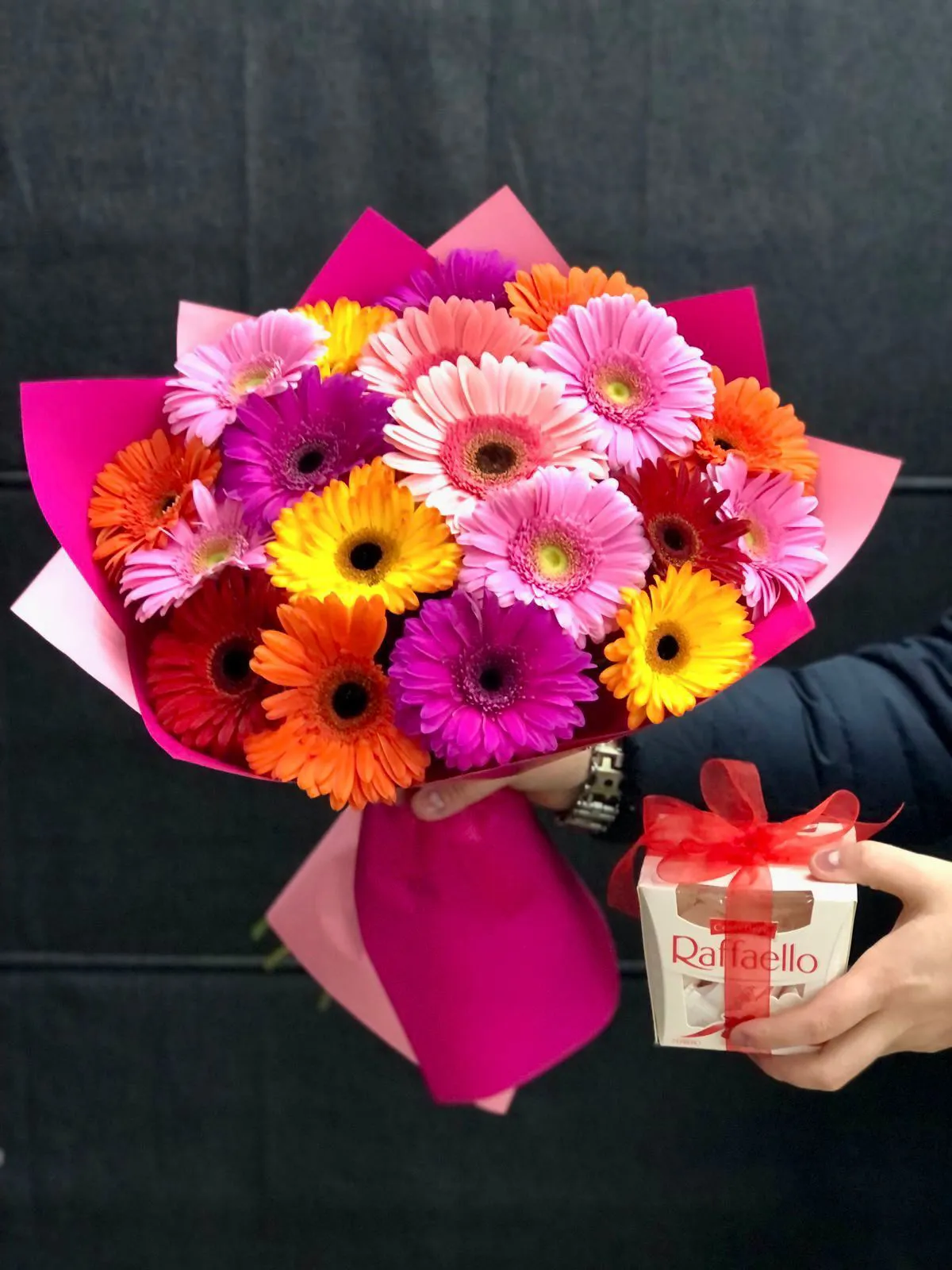 Герберы,упаковка,лента и рафаэлло |