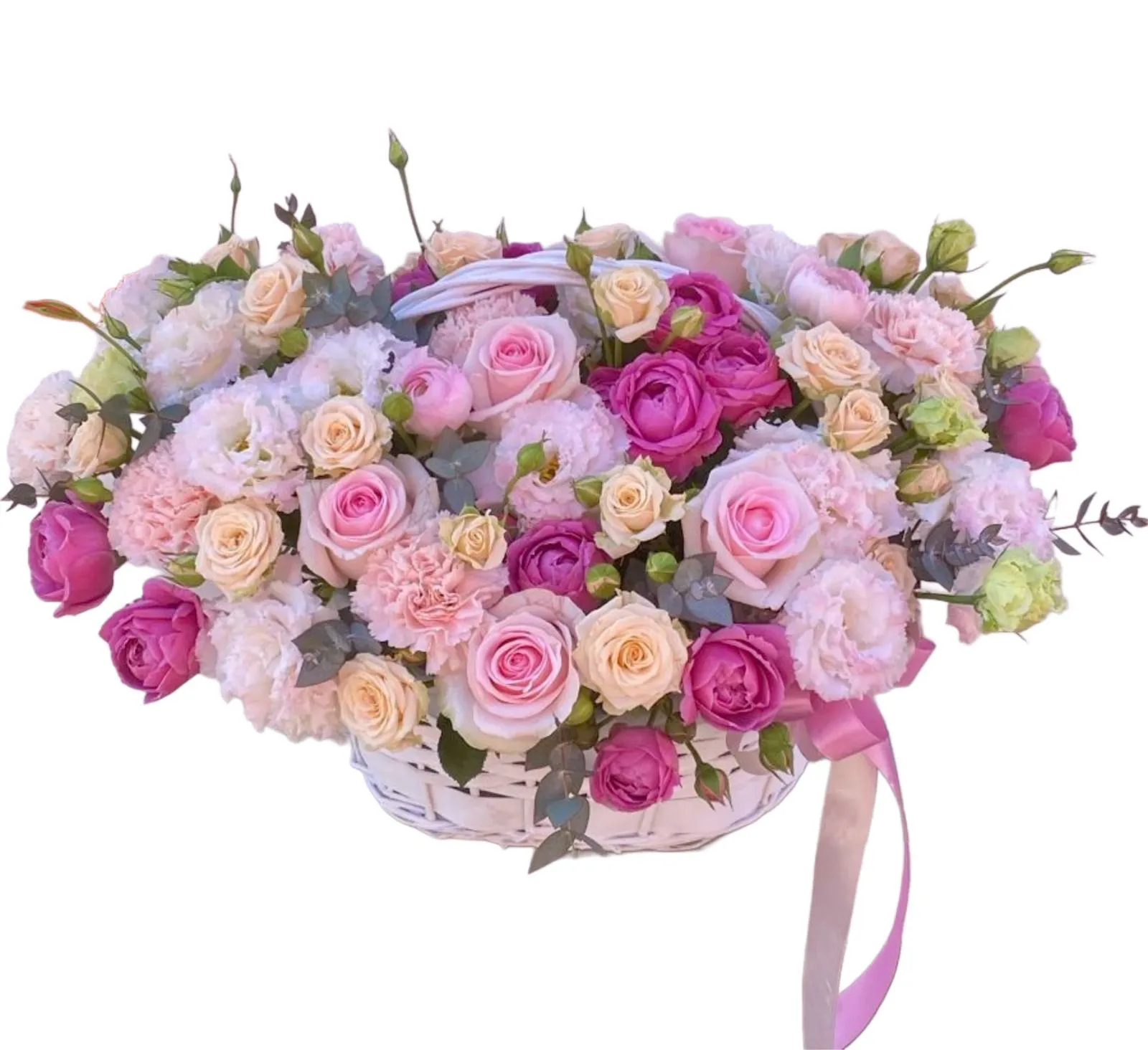 • Премиум - роза - 7 шт., пионовидная роза - 2 шт., кустовая роза - 6 шт., гвоздика - 4 шт., эустома - 4 шт., зелень, оазис, корзина
