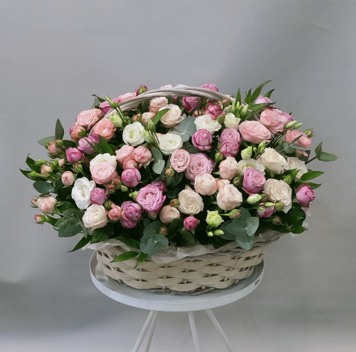 Вариант—Стандарт (роза пионовидная - 6 шт., роза кустовая - 5 шт., зелень, оазис, корзина)