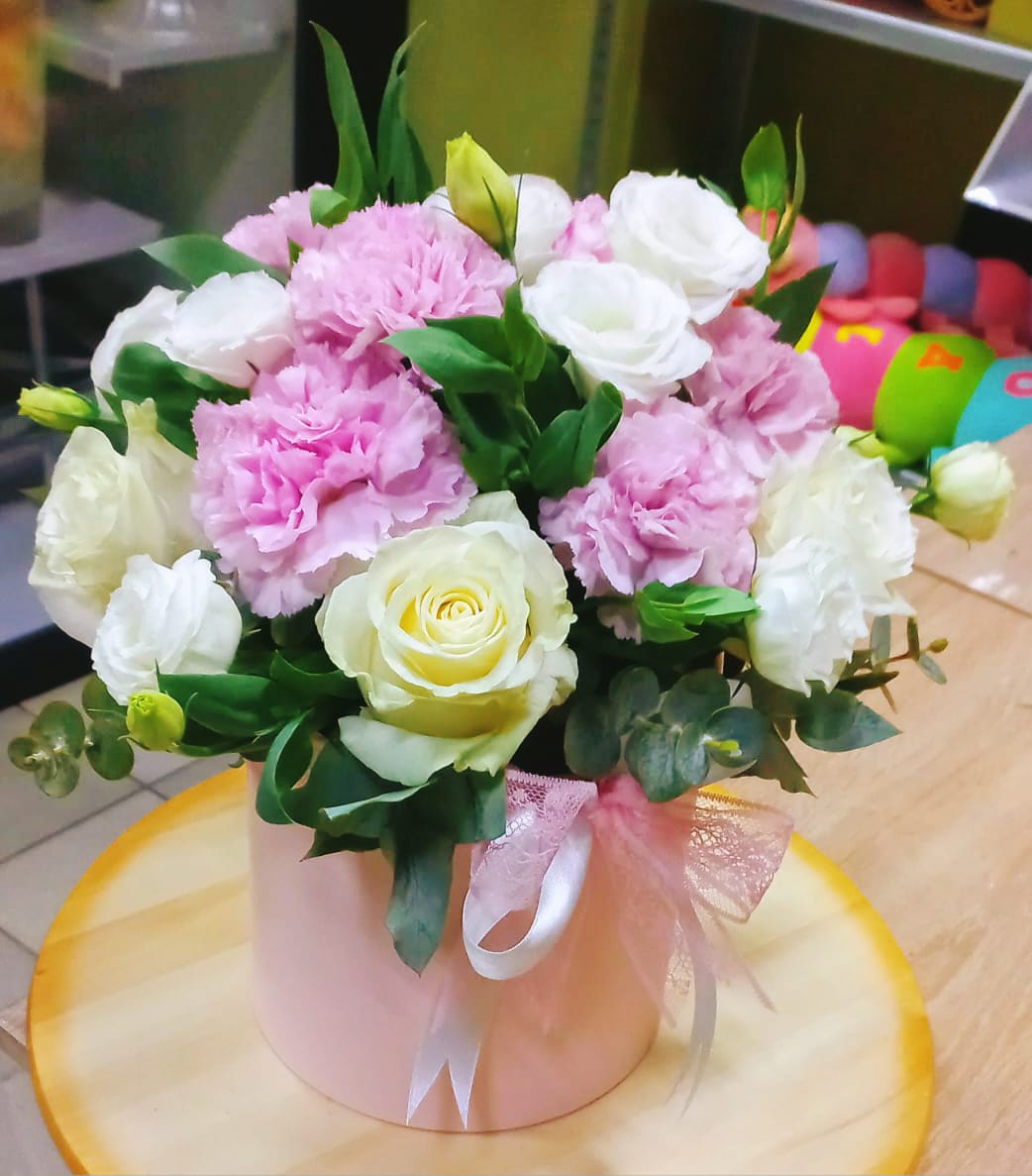 - Стандарт - эустома - 4 шт., роза - 5 шт., гвоздика - 7 шт., шляпная коробка, оазис
