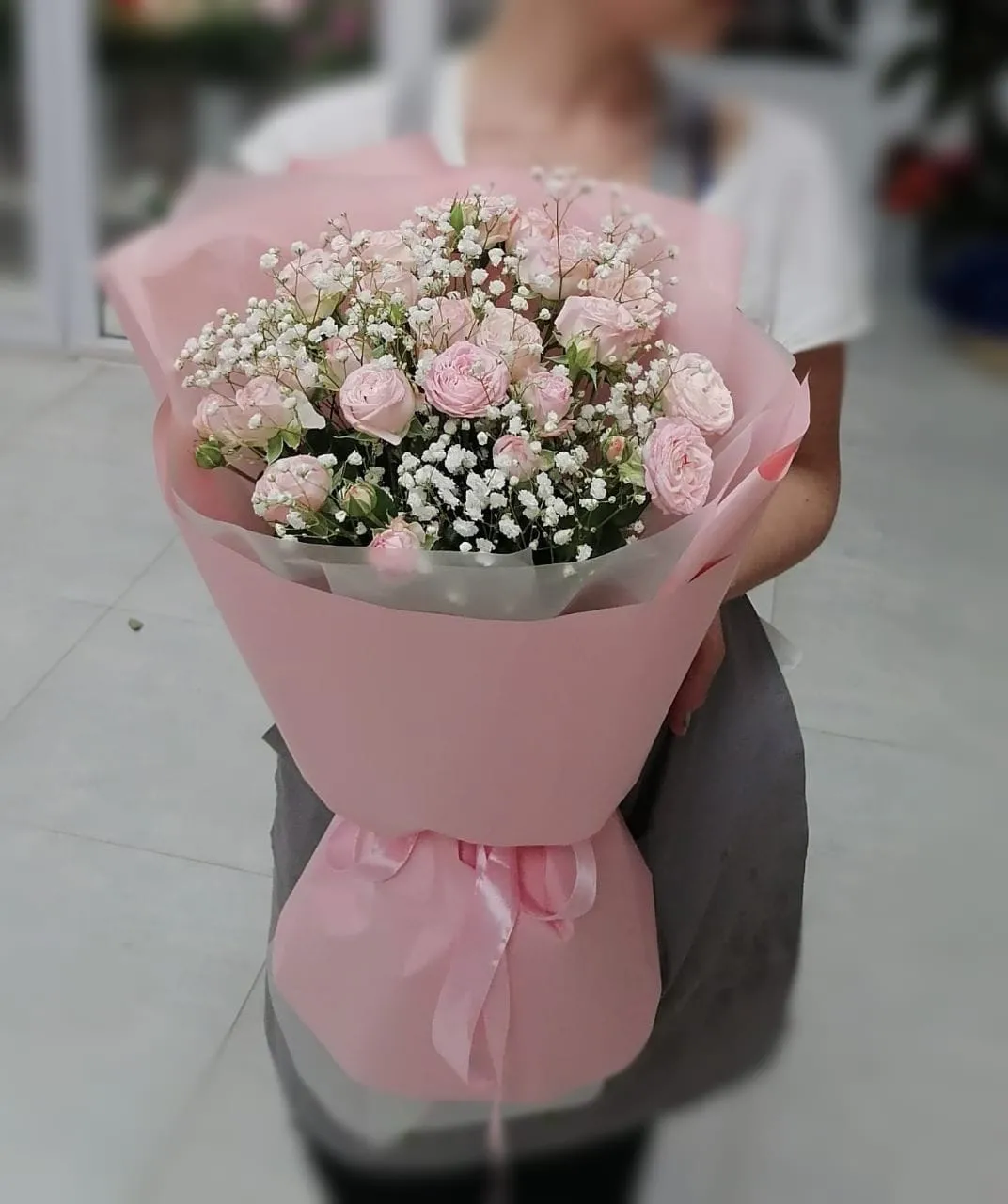 Вариант—Мини (роза кустовая - 3 шт., гипсофила, упаковка, лента)