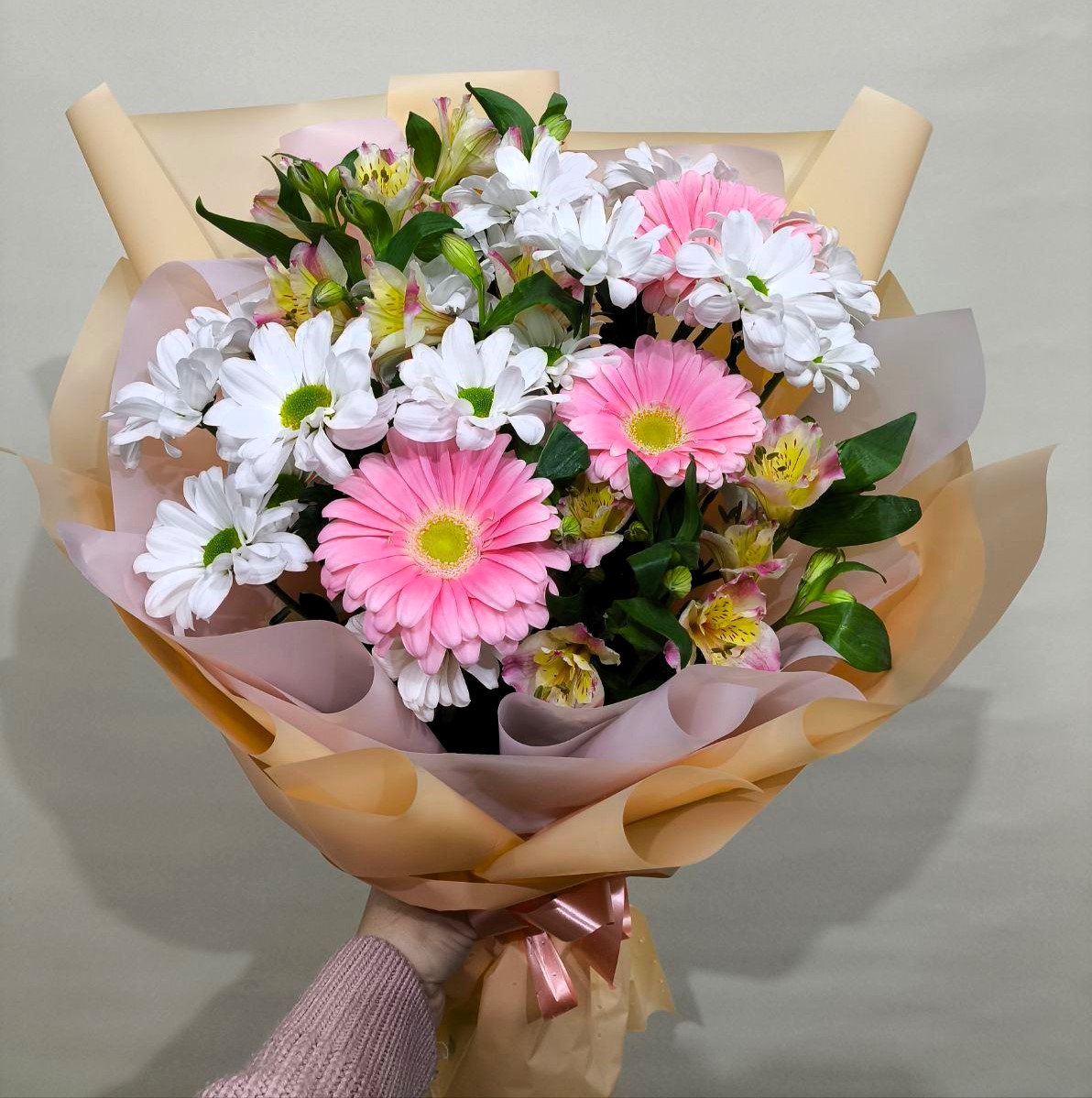 Вариант—Стандарт - гербера - 3 шт., хризантема - 2 шт., альстромерия - 3 шт., зелень, упаковка, лента