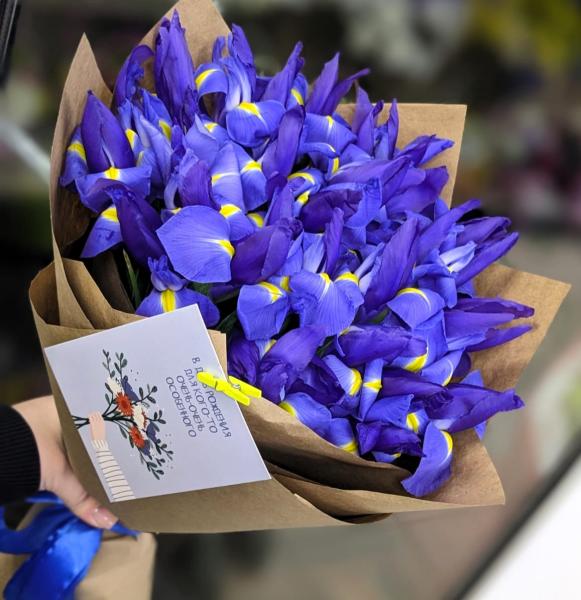 Синие ирисы – универсальные цветы, дарятся и женщине. Ирисы символизируют искренность и доверие. Подарить можно другу, коллеге или члену семьи, повод не важен – эмоции точно будут положительными.