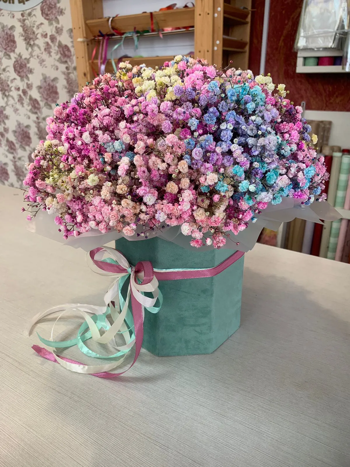 Нежная и воздушная композиция из гипсофилы в радужных оттенках, обязательно понравится получателю! Композиция будет радовать своей красотой очень долго ! Цветы расскажут о нежном и искреннем отношении, помогут признаться в романтических чувствах.. Это отличное украшение для любого праздника, подарок уместный для любого мероприятия. Пышность и объем готового букета будет зависеть от выбранного Вами количества цветов.