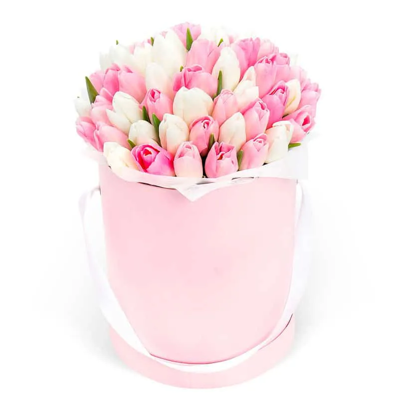 Состав букета: тюльпан 21 шт, оазис, шляпная коробка