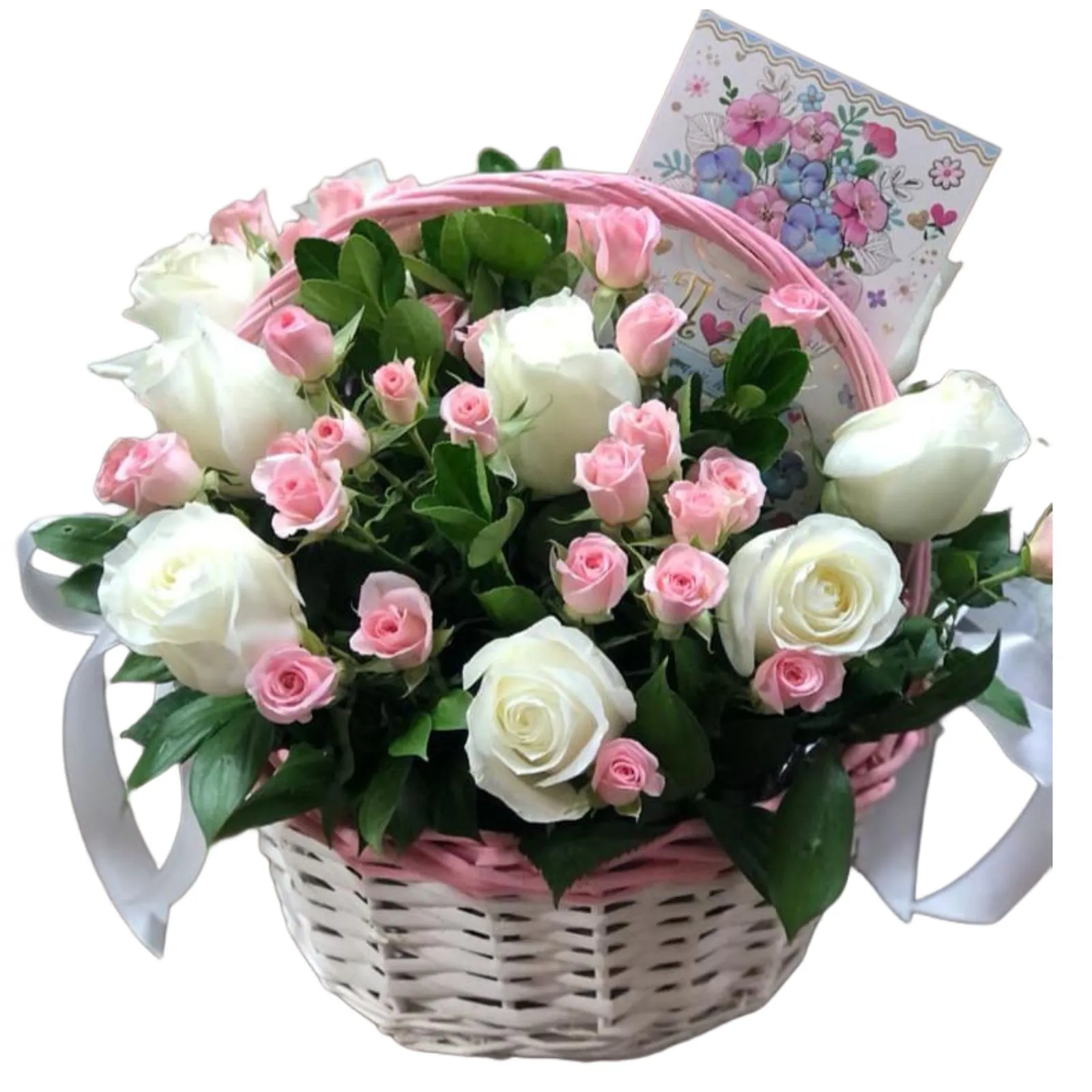 Вариант—Стандарт (роза - 9 шт., роза кустовая - 5 шт., зелень, оазис, корзина, лента)
