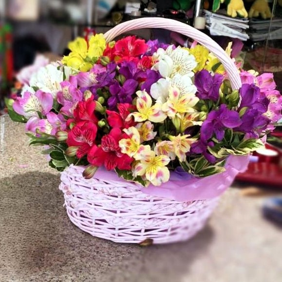 - Средний - альстромерия - 25 шт., декоративная зелень, оазис, корзина